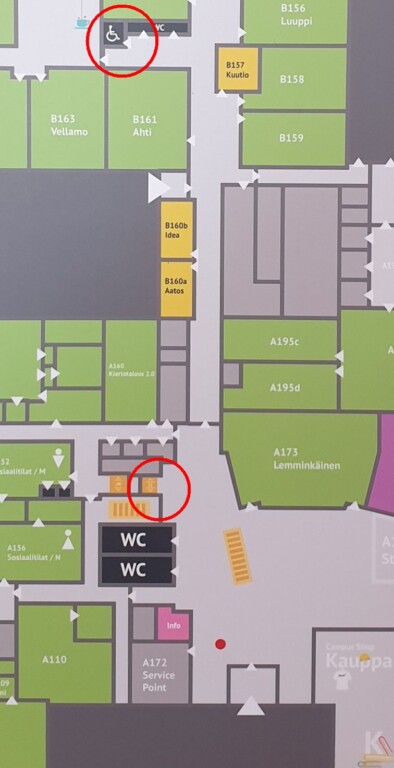 Lemppari. Järjestöjen tapaamisia ja oheistilaisuuksia sekä kokouksen lounastauot pidetään viereisessä Lemppari-rakennuksessa, jonne matka ovelta ovelle on noin 100 metriä. Lemppari on esteetön: sisäänkäynnissä on luiska, 3. kerroksen kokoustiloihin pääsee hissillä aulasta (kuvassa ympäröitynä aulan hissi sekä ylempänä esteetön wc).